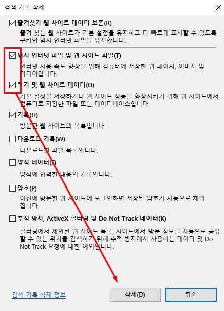 - 아래 사항 체크 후 삭제 클릭 후 컴퓨터 재부팅